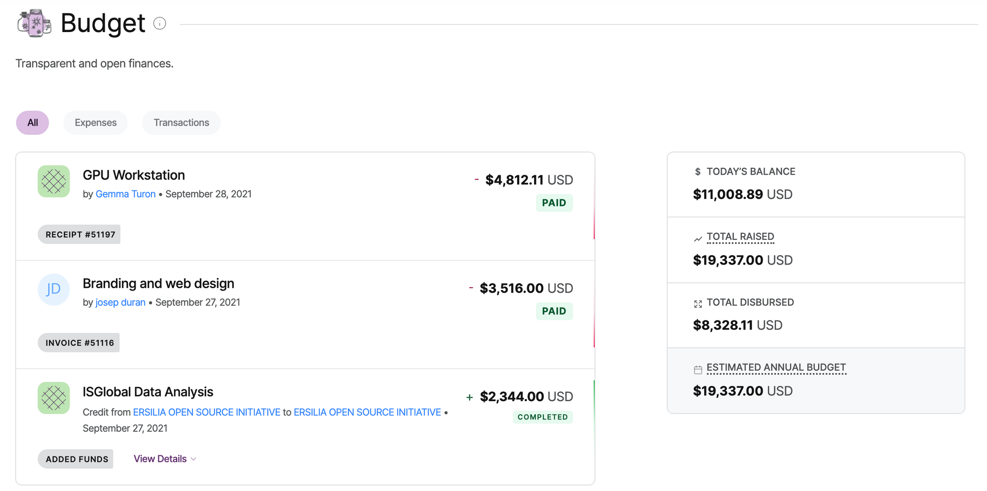 Today, thanks to Open Collective (OC), such projects can access the essential infrastructure to manage their finances. The Collective acts as a platform for fundraising, sponsorship and expense payouts, and, most importantly, a transparent budget.