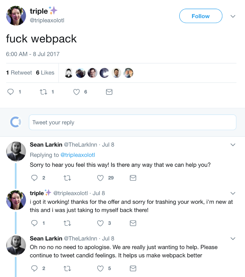 Even with trolls, we try to just say, “We’d love your help, and we’re sorry this is happening.” Most people do understand that you are human. Maybe we have an edge as grassroots projects without big companies behind them, because we can make mistakes and publish bugs and breaking changes, and as long as we’re open and helpful about it people will just say, “Yeah, it’s Webpack, it’s OK we love ‘em.”