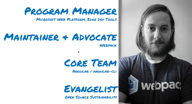 I’m a program manager for the Microsoft Web Platform, working on Edge Dev Tools. I’m also a maintainer of Webpack — I fit into the developer advocate role for the org. I’ve done some work with the Angular core team, and I’m an evangelist for open source sustainability.