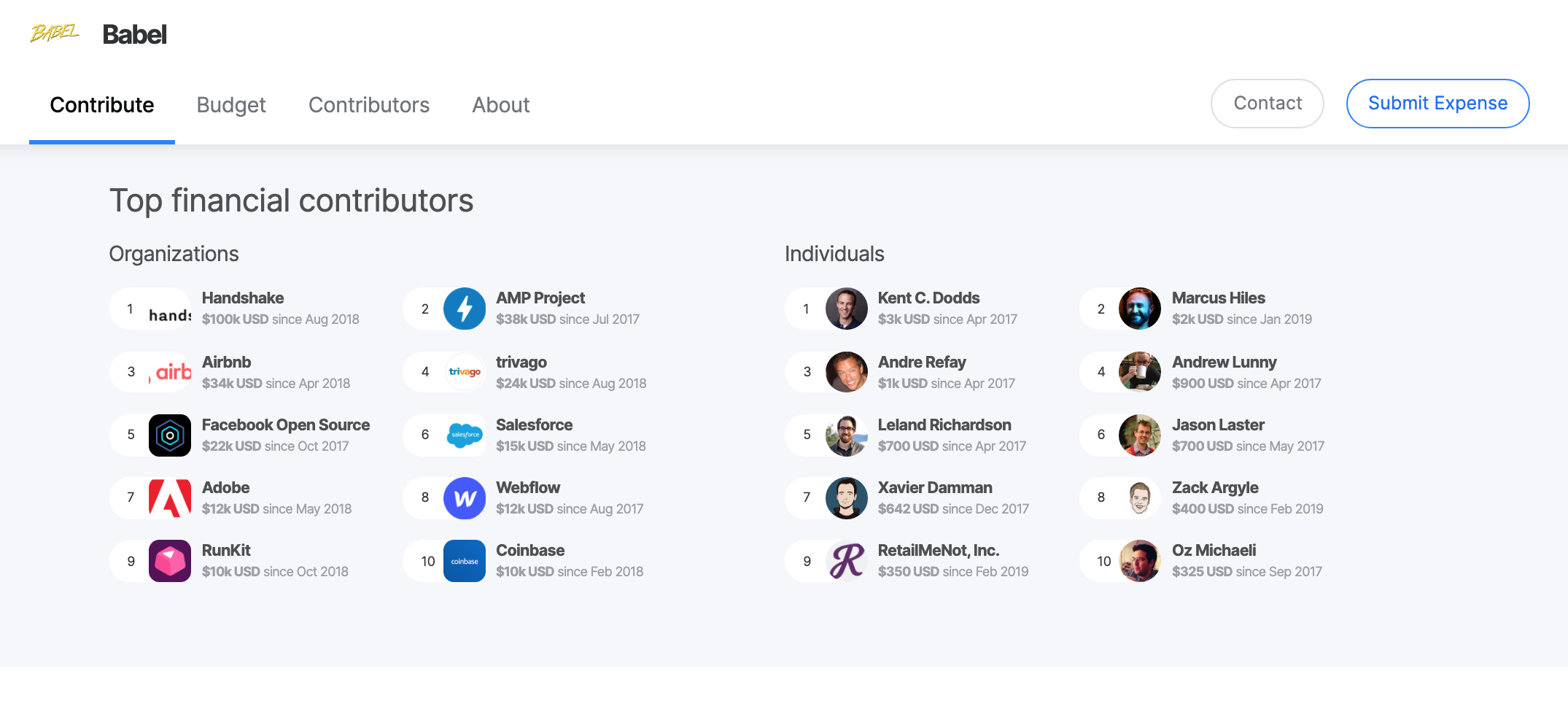 In order to treat contributions from Individuals and Organizations fairly, they now both appear side by side in a redesigned leaderboard, ordered by amount contributed.