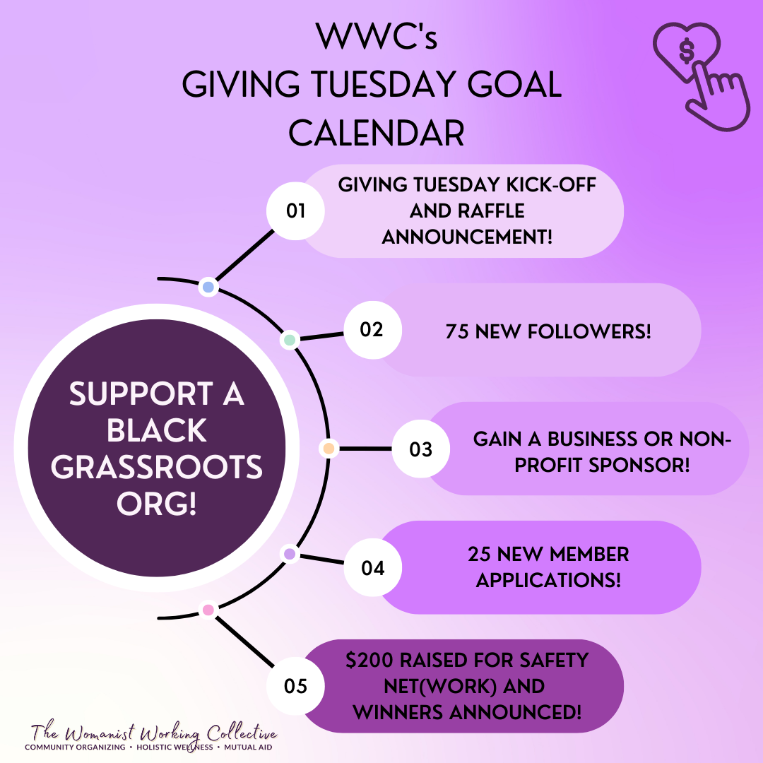 🌟 The Womanist Working Collective posted an important Giving Tuesday reminder to the community and provided a beautiful calendar graphic for their goals.