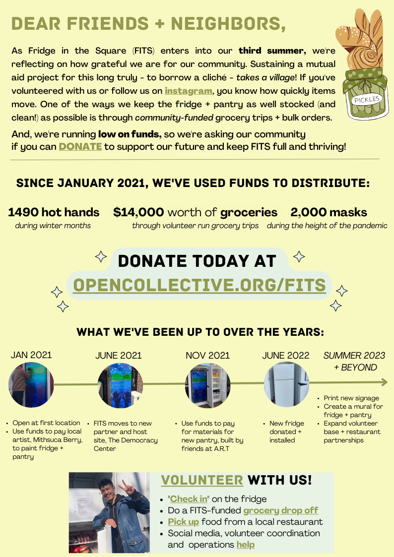 π Cambridge Community Fridge is a community fridge also known as "Fridge in the Square". They published an update with the sweetest graphic discussing their activity of the year, thus far. Entering their third summer they've distributed 1,490 hot hands, $14k worth of groceries, and 2,000 masks.