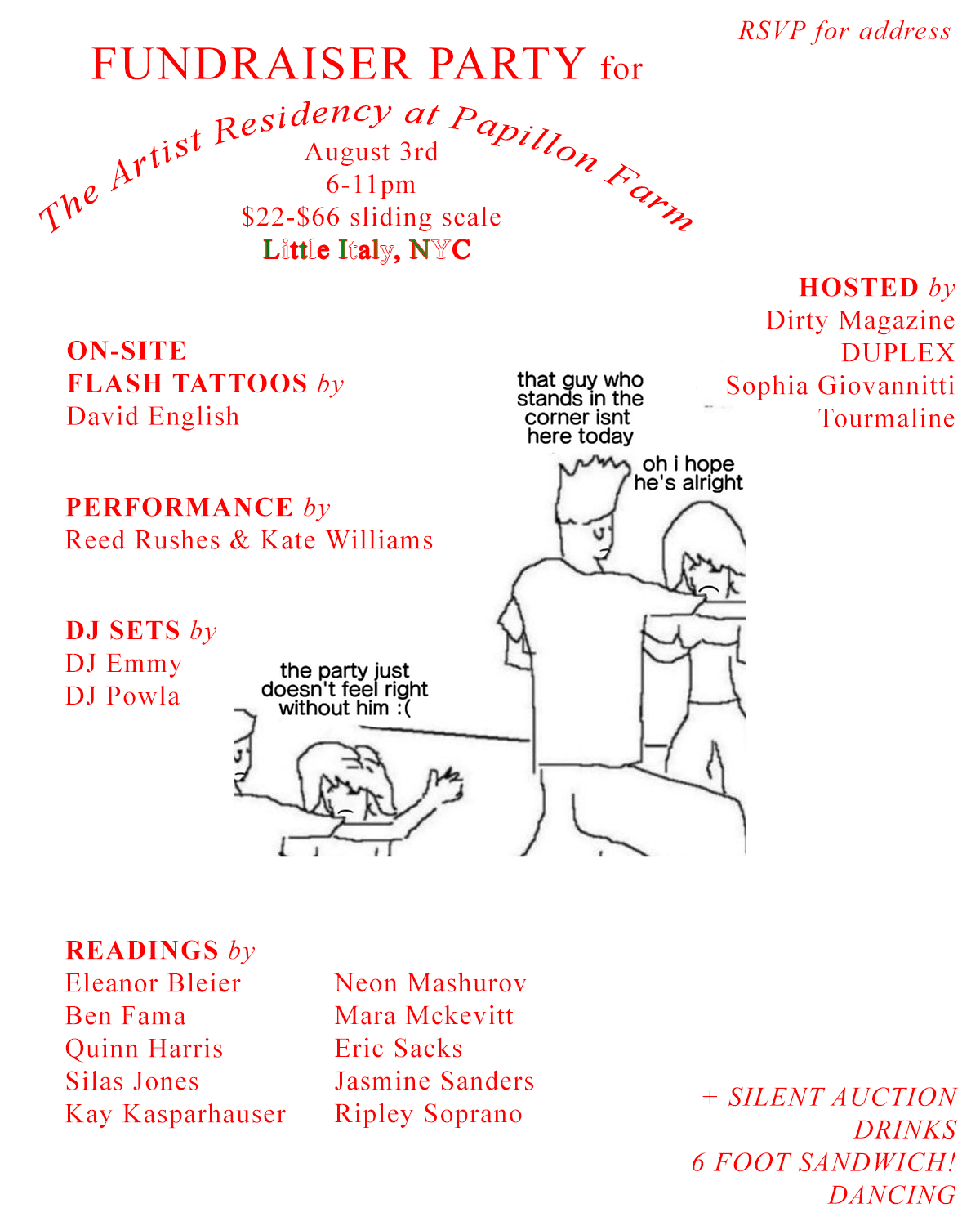 π Residency at Papillon Farm is an Artist Residency at Papillon Farm that provides unfettered access to 94 acres of land, dedicated workspace, and network support for emerging artists. They hosted their residency fundraiser in Little Italy in early August with flash tattoos, performances, DJs sets, readings and more!