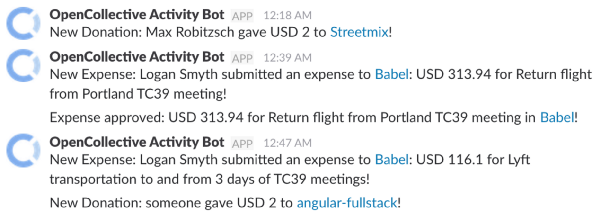 Pro tip: Receive Open Collective Notifications in your Slack or Gitter, so participants can see when you get donations and pay for expenses. Here’s how.