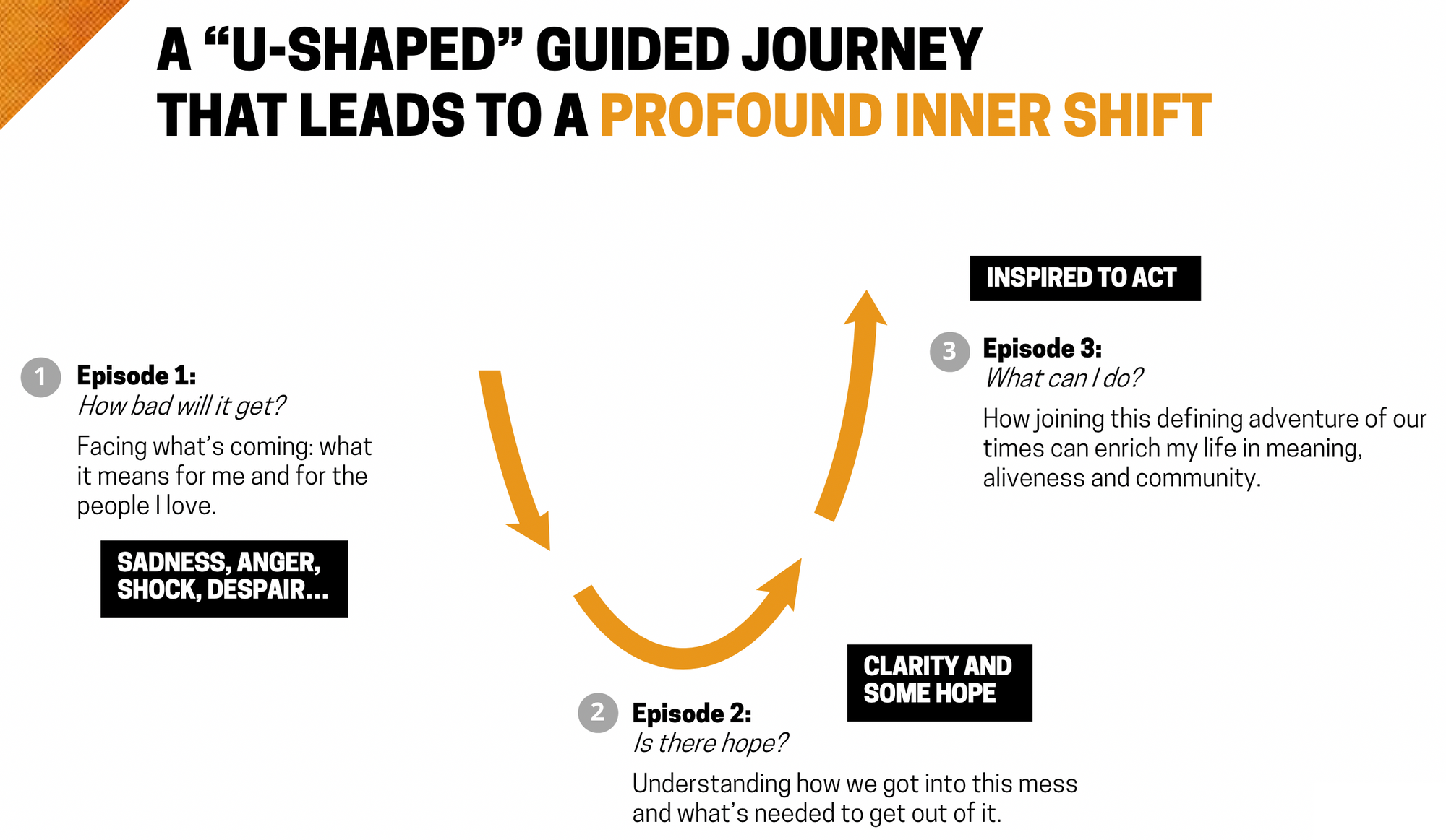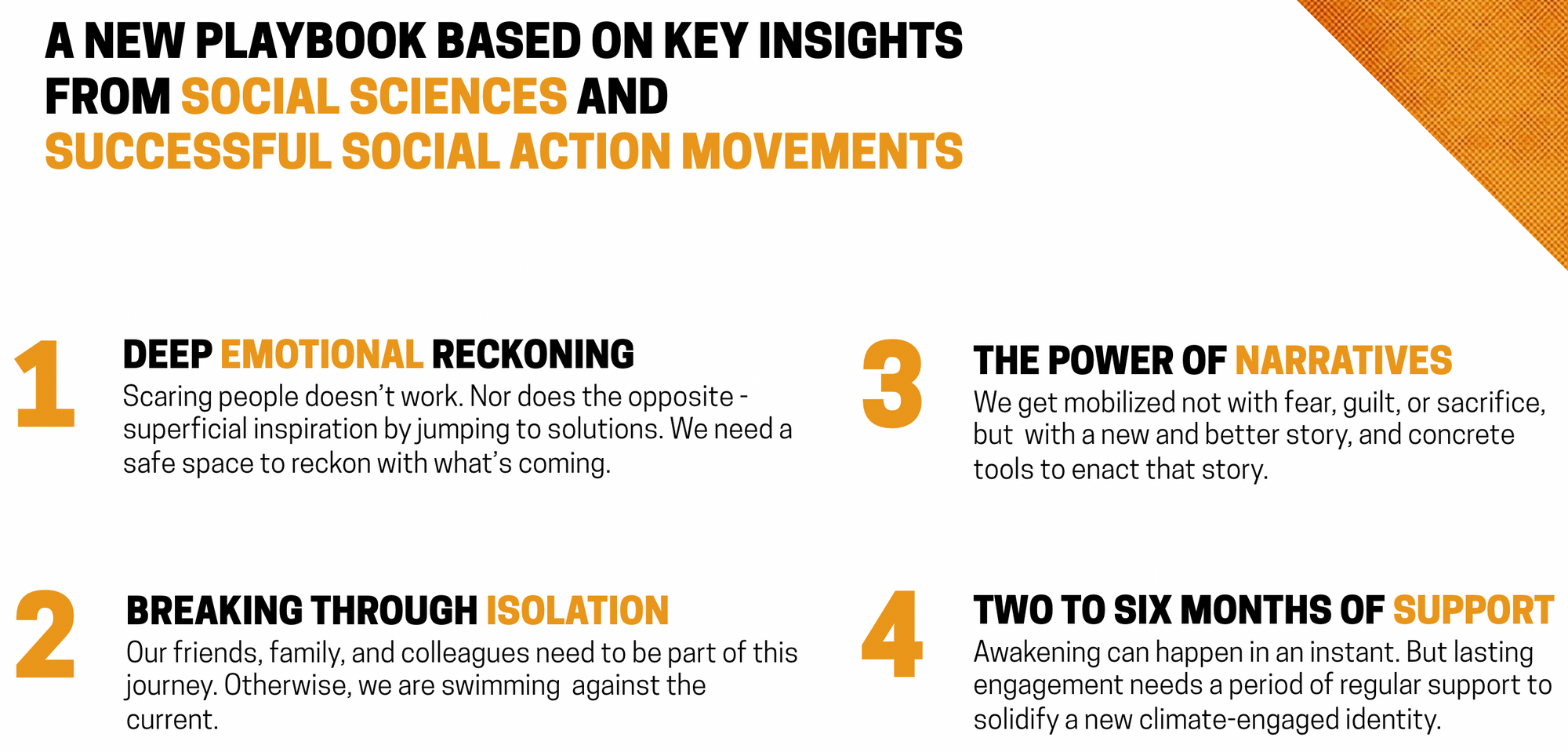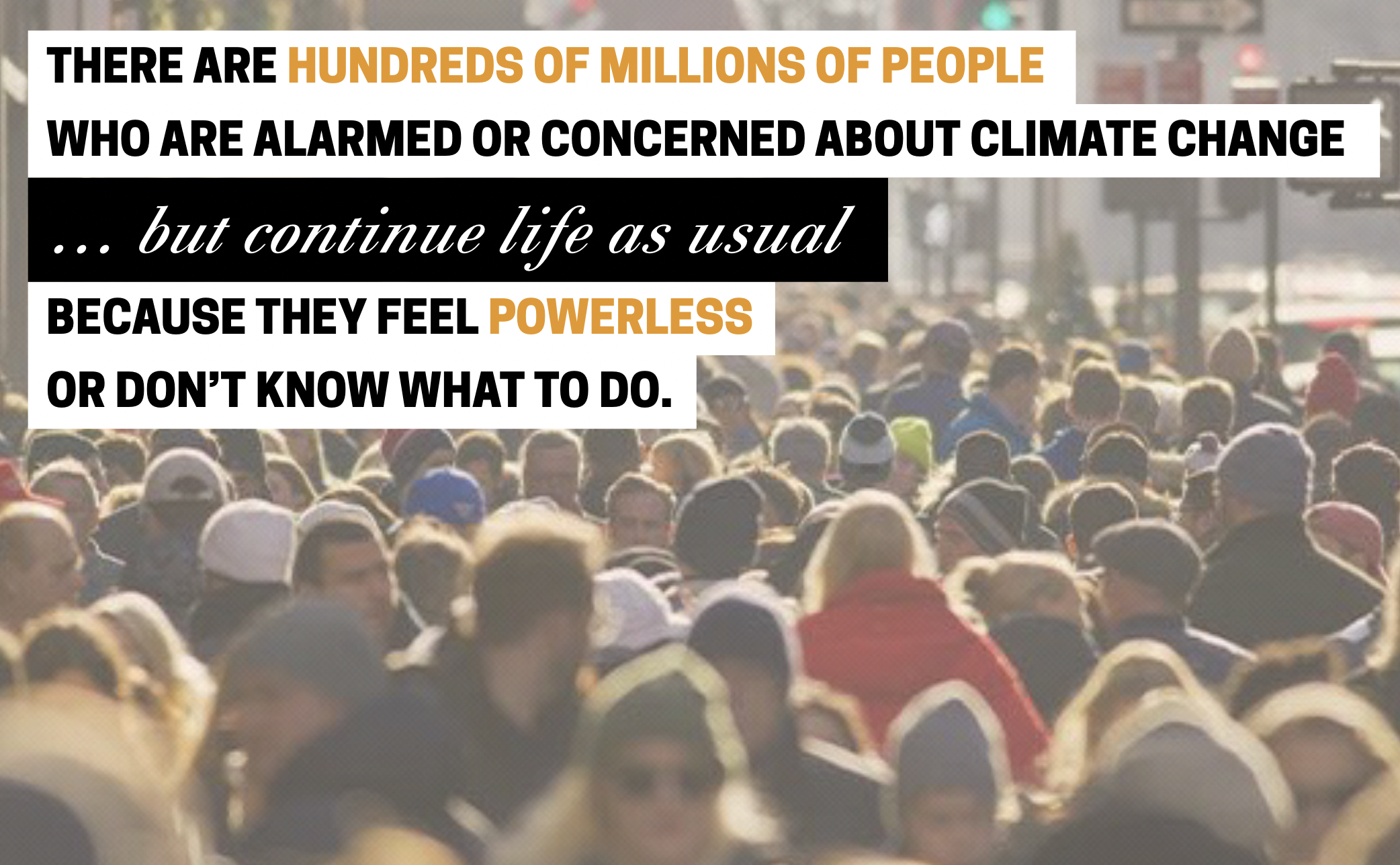 The goal is to ignite the broad middle: the majority of the population who are aware, concerned, and/or alarmed, but are not yet truly engaged, regardless of their political alignment or location.