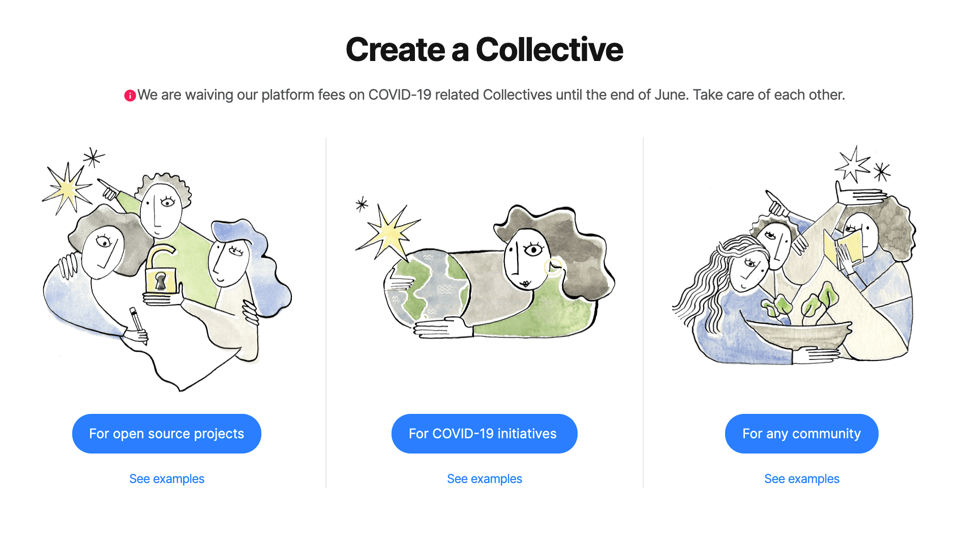 Let's work together to support each other. The past week we've seen a surge of Collectives created in solidarity with COVID-19 support efforts. At Open Collective, we are humbled both by the number of volunteers fighting for their communities and their trust in using our platform to do it.